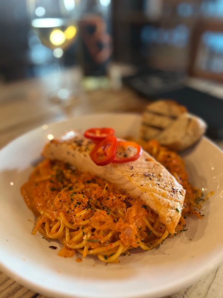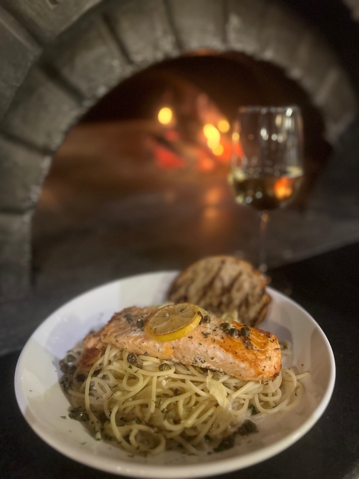 6 oz salmon filet served with a lemon-butter piccata sauce and crispy capers, over a bed of spaghetti.