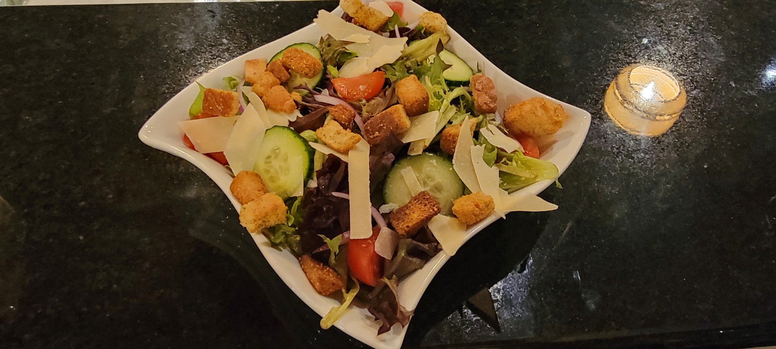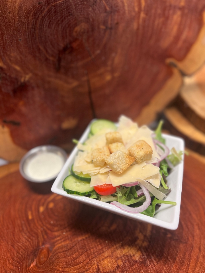 Fresh spring mix topped with tomatoes, red onions, cucumbers and seasoned croutons.