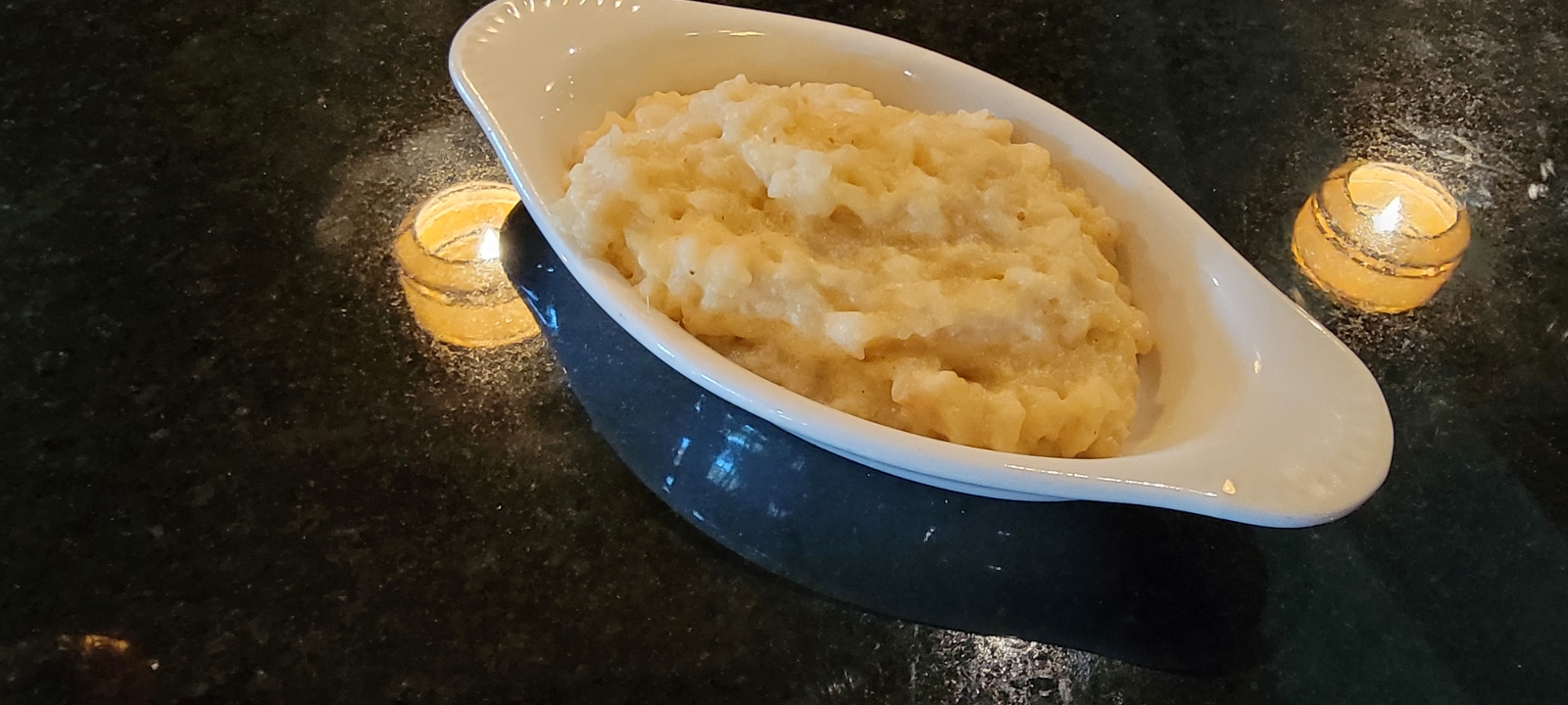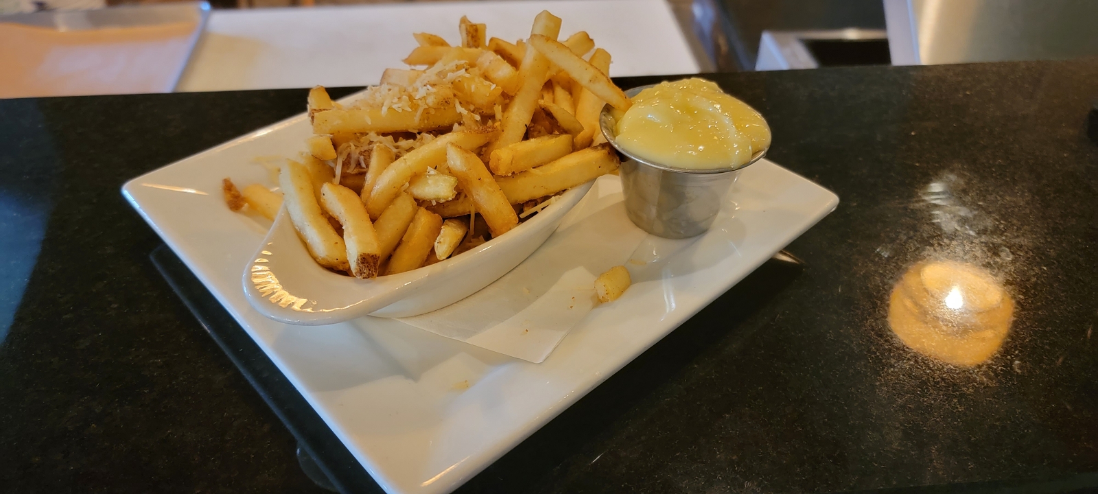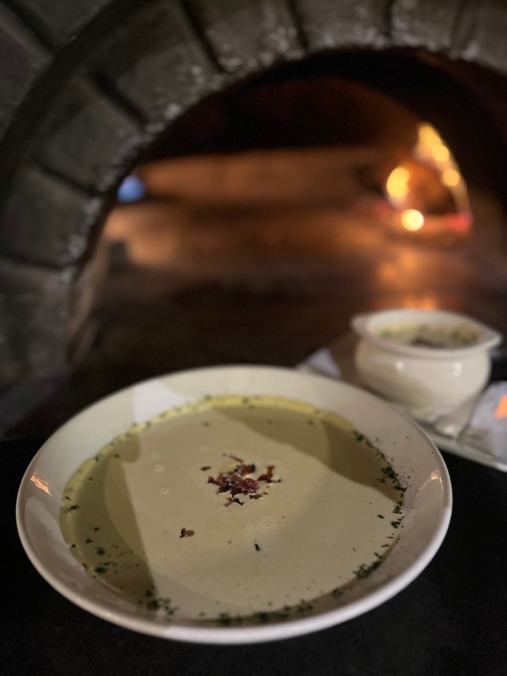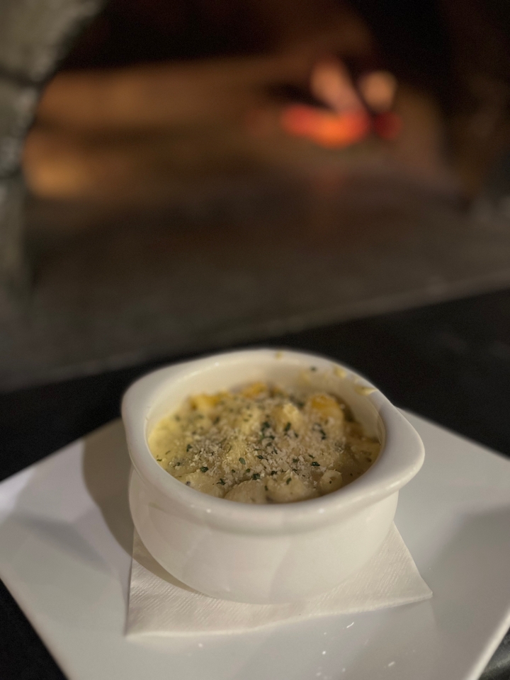 Jumbo tater tots filled with cheese, chives and sour cream. Topped with bacon, sour cream, and chives. Served over our creamy cheese béchamel sauce.