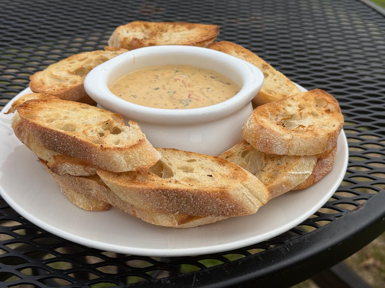 Chunks of lobster, spinach, bell peppers, and jalapeños mixed with white queso served hot with sliced crostini bread.