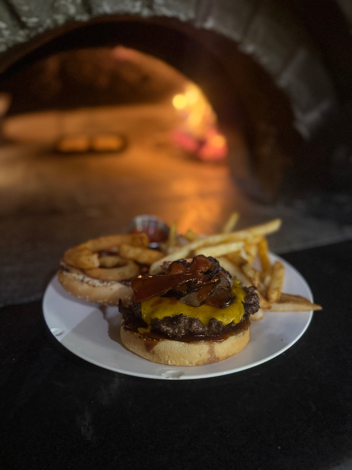 1/2 lb patty served on a warm sesame seed bun with a sweet and tangy BBQ sauce, cheddar cheese, applewood smoked bacon and crispy onion rings.