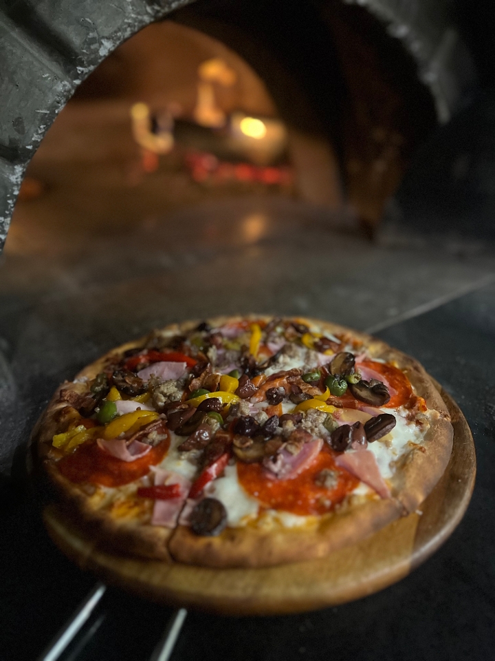 Pepperoni, Italian sausage, bacon crumbles, Canadian bacon, bell peppers, red onions, mushrooms, olives with mozzarella cheese and marinara.