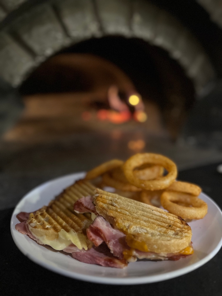 Served hot on freshly sliced panini bread, basil mayo, black forest ham, cheddar and havarti cheese.
