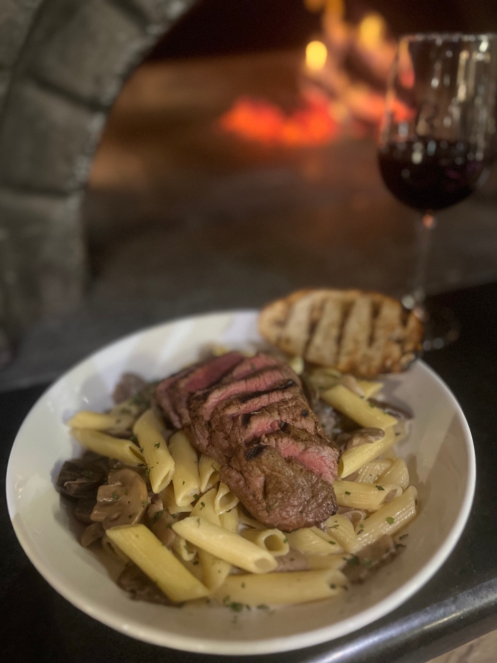 Sliced medium-rare filet served over penne pasta, finished with sliced red onions and a rich creamy mushroom marsala wine sauce.