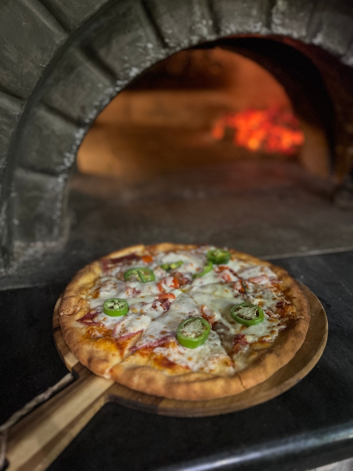 Prosciutto, salami, mozzarella, tomatoes, fresh jalapeños and basil with garlic Angelina sauce.