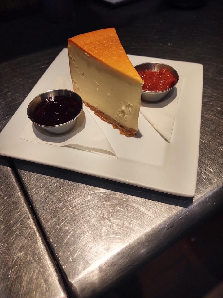 Rich and creamy cheesecake with a graham cracker crust. Served on a blueberry sauce and drizzled with a strawberry sauce.