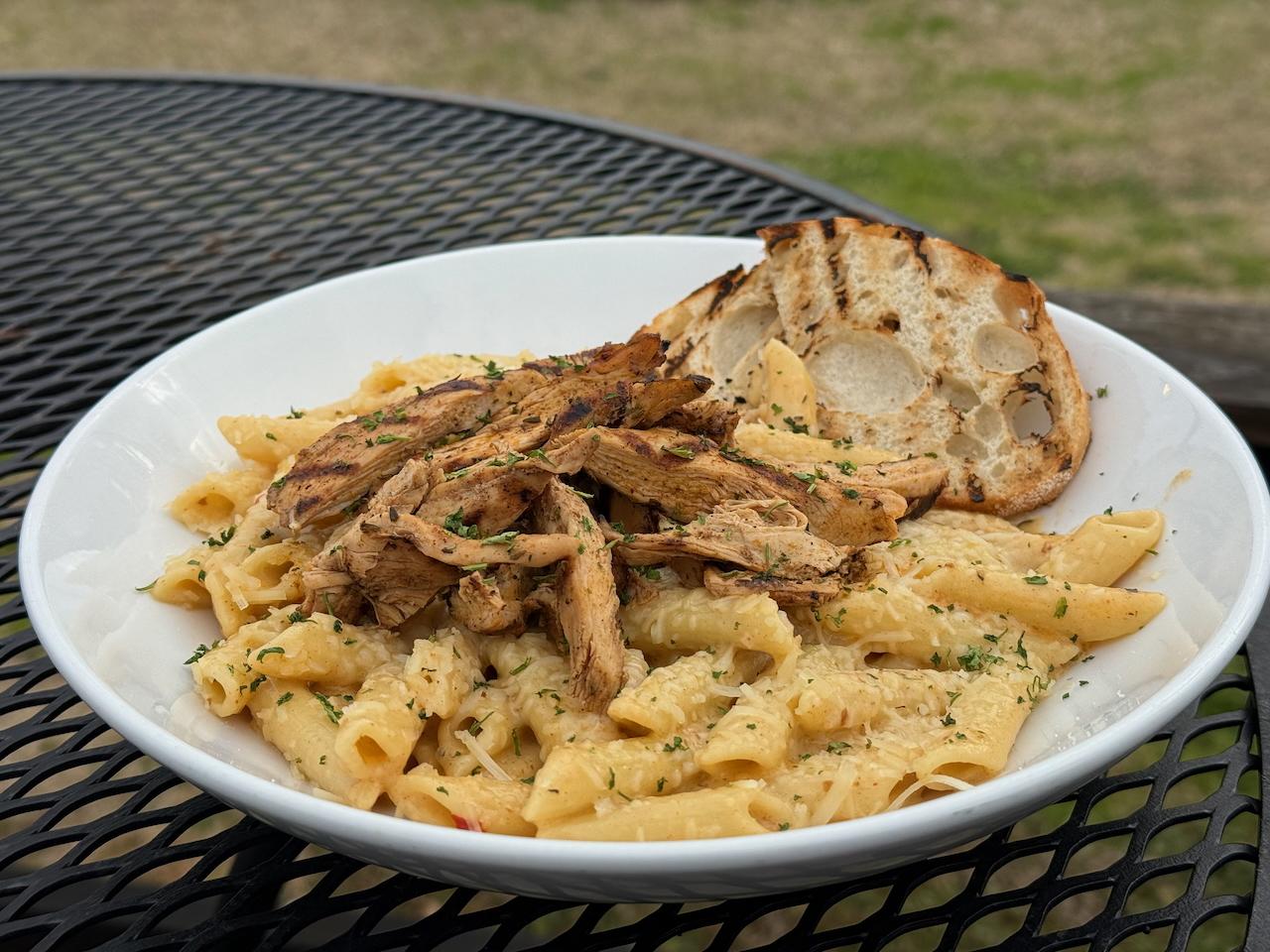 Creamy alfredo sauce served over penne pasta, topped with cajun seasoned chicken. Pair this dish with a dry white wine like our estate Blanco Grande, or our award winning Trebbiano.