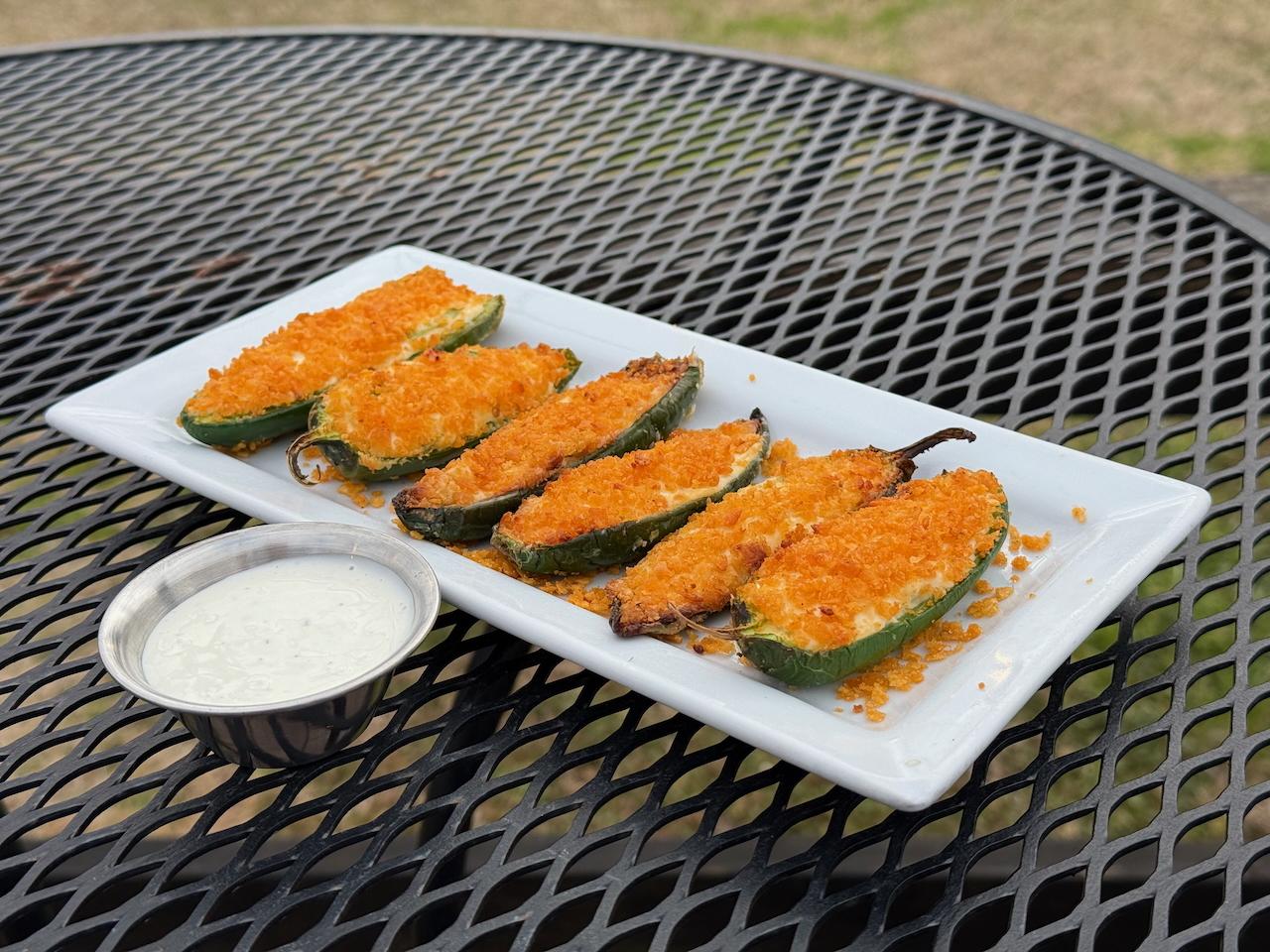 Fresh jalapeños stuffed with cream cheese, cilantro and green onion, topped with a secret crunchy topping and baked.