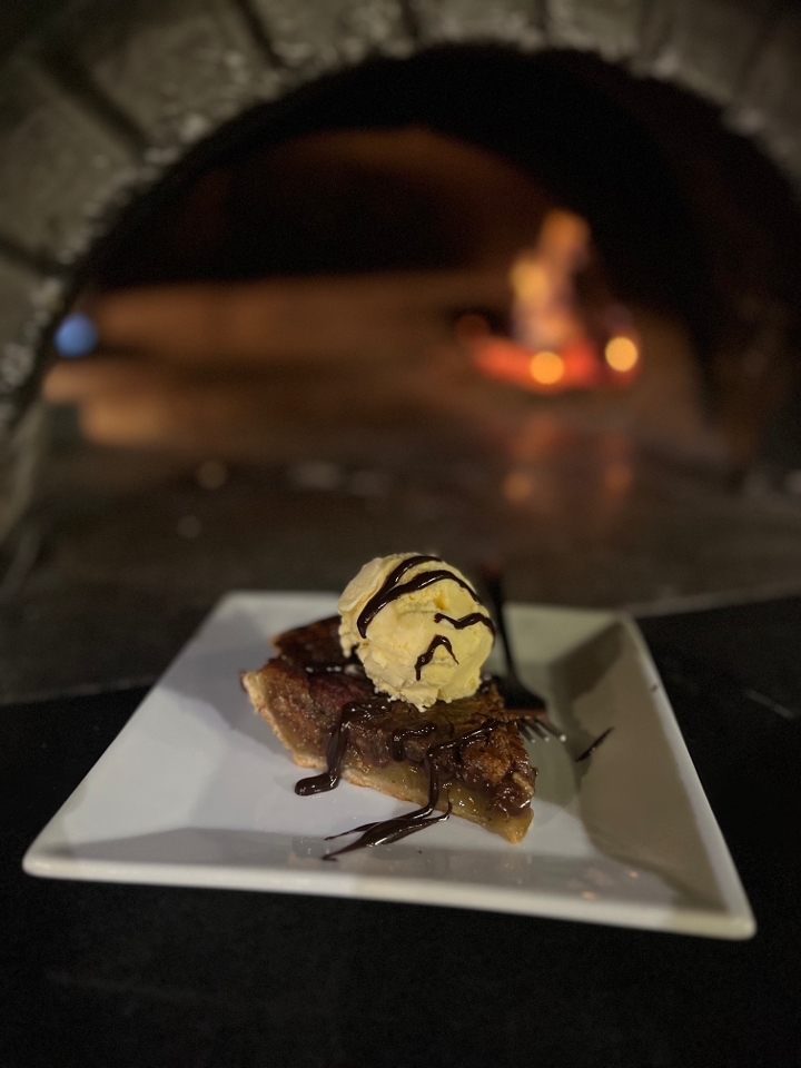 Decadent chocolate pecan pie, baked in buttery crust. Served with a scoop of vanilla ice cream. Pairs well with Mourvèdre