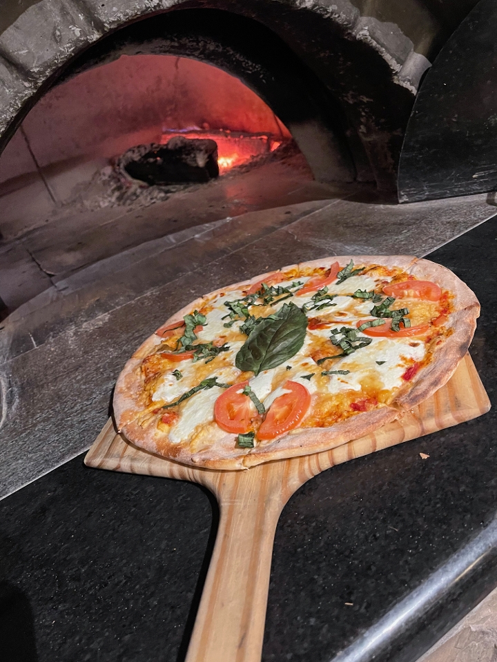 Marinara sauce, fresh basil, sliced Roma tomatoes and mozzarella cheese.