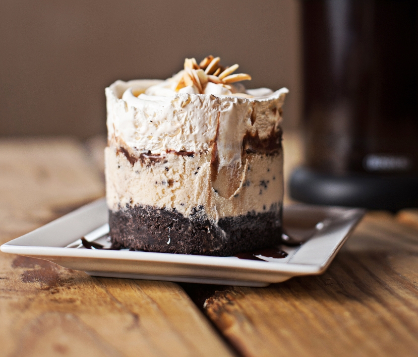 A decadent layered ice cream dessert with a crushed Oreo base, Amaretto ice cream and fudge, topped with whipped cream and almonds.