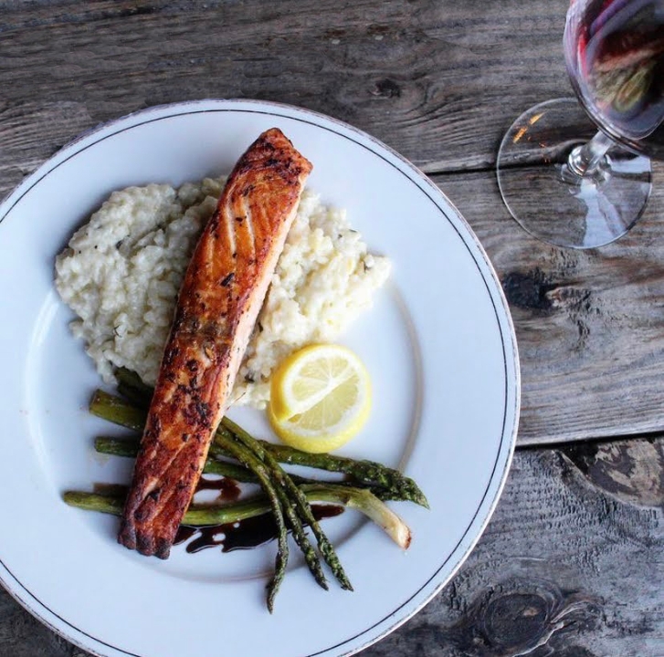 Freshly seasoned 6 oz salmon filet served over lemon cream risotto with asparagus.